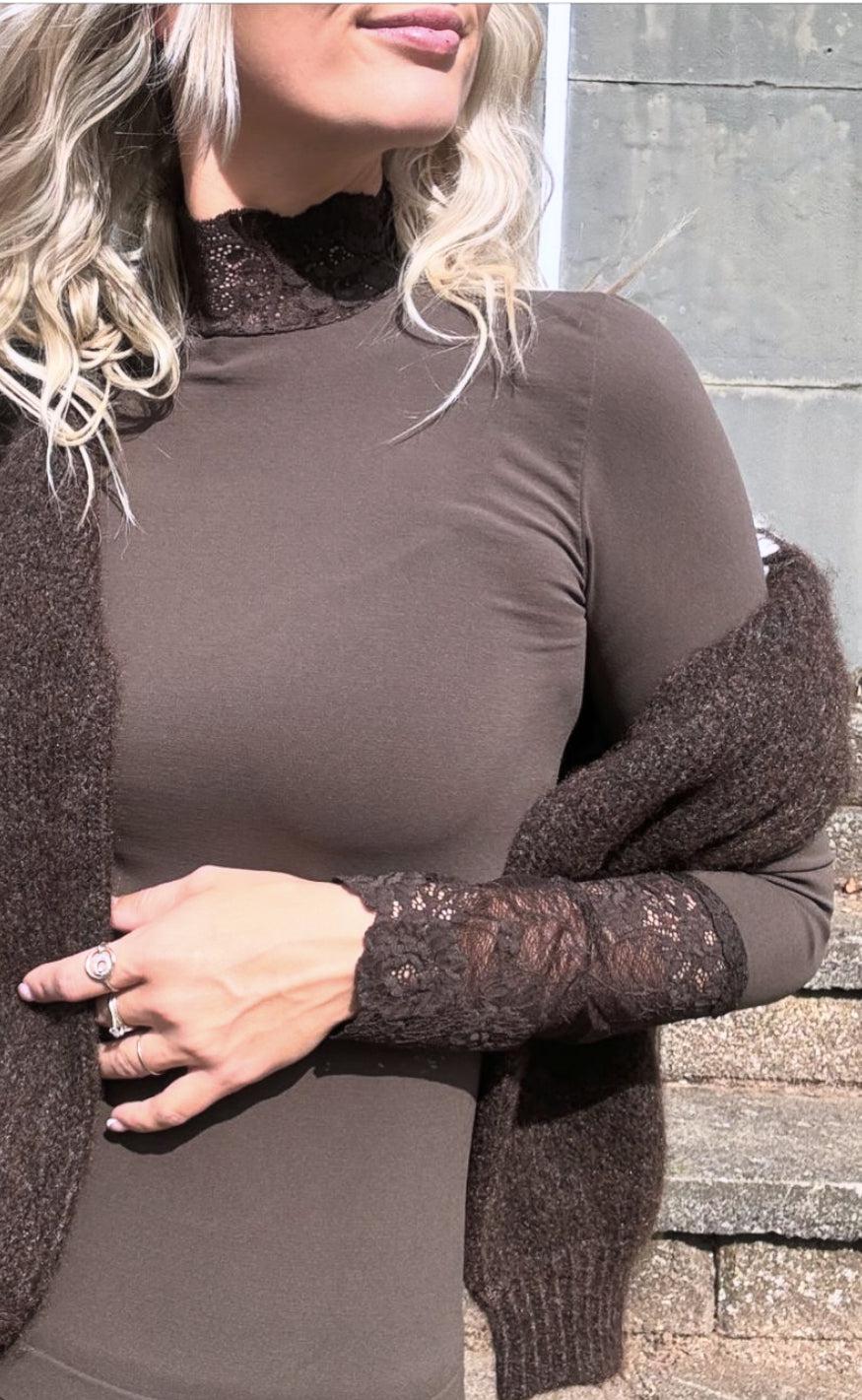 Elegante kanten body met V-hals en romantische ruches